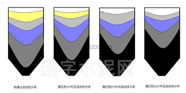 鋼板庫庫內(nèi)料重力分布依庫底流動性不同而不同,長期靜態(tài)沉積后形成硬性喇叭型分層固態(tài)過渡,總應(yīng)力為“V”型杯托支撐分布,總料重大部分由庫低環(huán)錐壁垂直支撐,而庫底壁水平外張力不高,出口壓力很低(一般僅在10kpa 以下)。 鋼板倉滿倉飽和沉積后的卸放,因鋼板庫庫底已形成流動性最低的飽和固態(tài),極易產(chǎn)生拱架阻塞,出料量越大越易拱塞斷料。 鋼板倉中倉飽和沉積后的靜態(tài)卸放,因庫底已形成流動性較低的高密度固態(tài),也易產(chǎn)生拱塞瓶頸限流或斷料。 鋼板倉低倉飽和沉積后的靜態(tài)卸放,因庫底壓力不大,其流動性尚達(dá)不到極低的飽和固態(tài),卸放過程要平順些。 七、粉庫自然動態(tài)卸放時的流動性分布與力學(xué)傳導(dǎo)特征 當(dāng)粉體庫底卸出運行同時鋼板庫庫頂進(jìn)料時,我們稱為動態(tài)運行。普通大庫的典型動態(tài)運行時的流動性分布如下圖 :