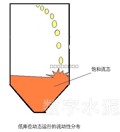3、復(fù)雜方式 其中,2、3方式因庫內(nèi)底部存在大量管路,長期運行后空氣中水份在氣粉接合部會產(chǎn)生水凝結(jié)沉積板結(jié),累積形成水硬性阻塞,最后必須徹底停產(chǎn)進(jìn)行人工清除維護(hù)。另外,由于需持續(xù)通電吹氣以維持穩(wěn)定的流動性,卸料運行能耗很高。再者,2、3方式處于中高庫位工作時,其大庫底部料的流動性必然處于級別5或4的高固態(tài),強(qiáng)制吹入空氣后不易形成穩(wěn)定的飽和流態(tài),且必然吹空庫底排氣口局部空間形成空洞群,最終在大庫底部內(nèi)必然形成不規(guī)則周期性空洞垮塌性下陷沖擊,進(jìn)一步擴(kuò)大出料波動性。 十一、理想的動態(tài)下卸時流動性分布與力學(xué)傳導(dǎo)特征 根據(jù)上述分析,顯然理想的卸料系統(tǒng)的流動性特征目標(biāo)應(yīng)如下: 1、從進(jìn)料到出料要全面合理的動態(tài)平衡料容(料位)位設(shè)計范圍,避免共用同一庫進(jìn)行大范圍的供料流量切換。 2、流動性保持在2、3的中間級別時,即半流態(tài)和中流態(tài)時對后續(xù)控制有利,要有目的地防止流動性向過低(0、1級別)和過高(4、5級別)方向發(fā)展變化,如此使內(nèi)部有利于整體流的形成,從而對卸料裝置的穩(wěn)定控制特性有利。 3、應(yīng)根據(jù)工作流量和工作方式來設(shè)計合理的庫容尺寸,盡可能使生產(chǎn)時的庫位動態(tài)變化范圍處于有利的條件下。