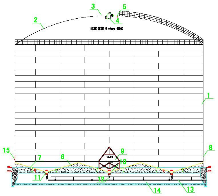 大型鋼板倉(cāng)原理圖 1—庫(kù)體;2—庫(kù)頂;3—料位計(jì);4—入料管;5—安全閥;6—導(dǎo)料錐; 7—環(huán)形內(nèi)區(qū)氣化管;8—環(huán)形外區(qū)氣化管;9-減壓錐;10—中心區(qū)氣化管 11—垂直下料口;12—下料閥;13—出料涌管;14—廊道;15—人孔及觀察孔 。 (1)、當(dāng)物料存到一定料位后,先打開放風(fēng)閥使其空運(yùn)慢慢關(guān)閉放風(fēng)閥由鋼板庫(kù)外圍的住進(jìn)氣管道將風(fēng)送入庫(kù)內(nèi)、通過(guò)電磁閥氣流分別進(jìn)入外環(huán)內(nèi)環(huán),將物料達(dá)到活化狀態(tài),經(jīng)發(fā)送器的集料、射流作用,物料進(jìn)入輸料涌管。 (2)、輸料涌管采用外置管式助氣增壓輸送裝置,輸料管內(nèi)通入一定的風(fēng)量進(jìn)入輸料管中,物料的粒群在輸料管中松散開,物料顆粒均被懸浮在氣流中,呈現(xiàn)類似流體的特性,具有較好流動(dòng)性。物料輸送的動(dòng)力來(lái)源三部分:1)、下料口下為正壓推送(卸料氣壓產(chǎn)生的物料流化壓力);2)、提升機(jī)喂料口處收塵器負(fù)壓吸送;3)、發(fā)送器的主吹射流及輸料管的助吹補(bǔ)氣。這種管道氣力輸送方式的輸送物料料氣比可達(dá)200以上,屬于超高密相氣力輸送(料氣比>30為密相氣力輸送),可以滿足各種提升機(jī)產(chǎn)量需求。 (3)、內(nèi)外環(huán)區(qū)相鄰卸料槽間設(shè)置導(dǎo)料錐,導(dǎo)料錐的作用:1)、增設(shè)導(dǎo)料錐可以減少庫(kù)內(nèi)積料,提高鋼板庫(kù)卸空率。2)、庫(kù)底導(dǎo)料錐可以將物料匯集到相鄰槽間,提高壓縮空氣的使用效率增加逐流作用。 (4)、可以提高充氣面積,使庫(kù)底物料更蓬松,增加物料流動(dòng)性。 (5)、在儲(chǔ)存庫(kù)底環(huán)形卸料區(qū),每幾供氣區(qū)為一個(gè)獨(dú)立卸料單元。1-7個(gè)卸料單元,由一條裝有電磁閥(電動(dòng)閥門)的管道供氣,外環(huán)形卸料和內(nèi)環(huán)形卸料區(qū)為高壓供氣區(qū)。儲(chǔ)存庫(kù)供氣系統(tǒng)由若干電磁閥(電動(dòng)閥門)配合電控柜,既可實(shí)現(xiàn)本地手動(dòng)、自動(dòng)控制,也可連接中控實(shí)現(xiàn)遠(yuǎn)程自動(dòng)化控制。 |